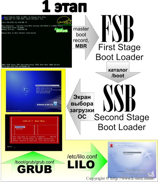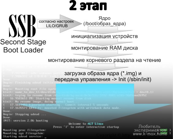 Не углубляясь в кучу терминов и определений, данный этап можно описать следующими словами: BIOS из MBR (первые 512 байт диска, выбранного для загрузки) загружает First Boot Loader. FSB находит вторичный загрузчик, используя таблицу разделов, просматривая ее, обнаруживает активный раздел, после обнаружения этого раздела — загружает SSB в оперативную память и запускает его. Для корректной загрузки, активный раздел должен содержать каталог /boot, который должен находиться в начале диска и содержать Second Stage Boot Loader. В целом, SSB — это программа, которая выводит список вариантов загрузки (меню выбора загрузки операционной системы). Загрузчиком может быть LILO (более старый) или GRUB. Загрузчик берет свои настройки из конфигурационного файла (/etc/lilo.conf — для LILO и /boot/grub/grub.conf или /boot/grub/menu.lst — для GRUB). Существуют и другие версии загрузчиков, такие как syslinux, PXElinux, Isolinux, uBoot, но для наглядности, в статье я затронул только LILO и GRUB. Хочу отметить, что исторически (до появления загрузчиков LILO, GRUB и др. и когда образ ядра занимал объем не боле 1,44 Мб) данного этапа не существовало и загрузка происходила с дискеты без файловой системы, на которую был записан образ ядра Linux, который (образ) содержал в себе MBR, то есть BIOS загружал сразу образ ядра и передавал ему управление.