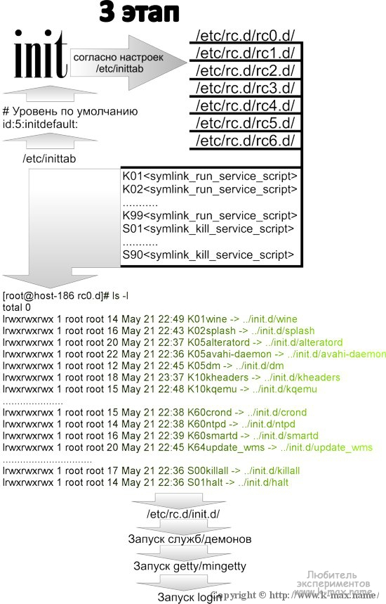 Далее, процесс init согласно уровню загрузки просматривает каталог /etc/rc.d/rc0.d/ (в данном примере, цифра 0(ноль) в имени rc0.d соответствует уровню загрузки — нулевому), в котором содержатся симлинки (ссылки) на скрипты запуска системных служб, которые, в свою очередь, расположены в /etc/rc.d/init.d/ (для Red Hat) или в /etc/init.d/ (для Debian). Ссылки имеют следующий формат: