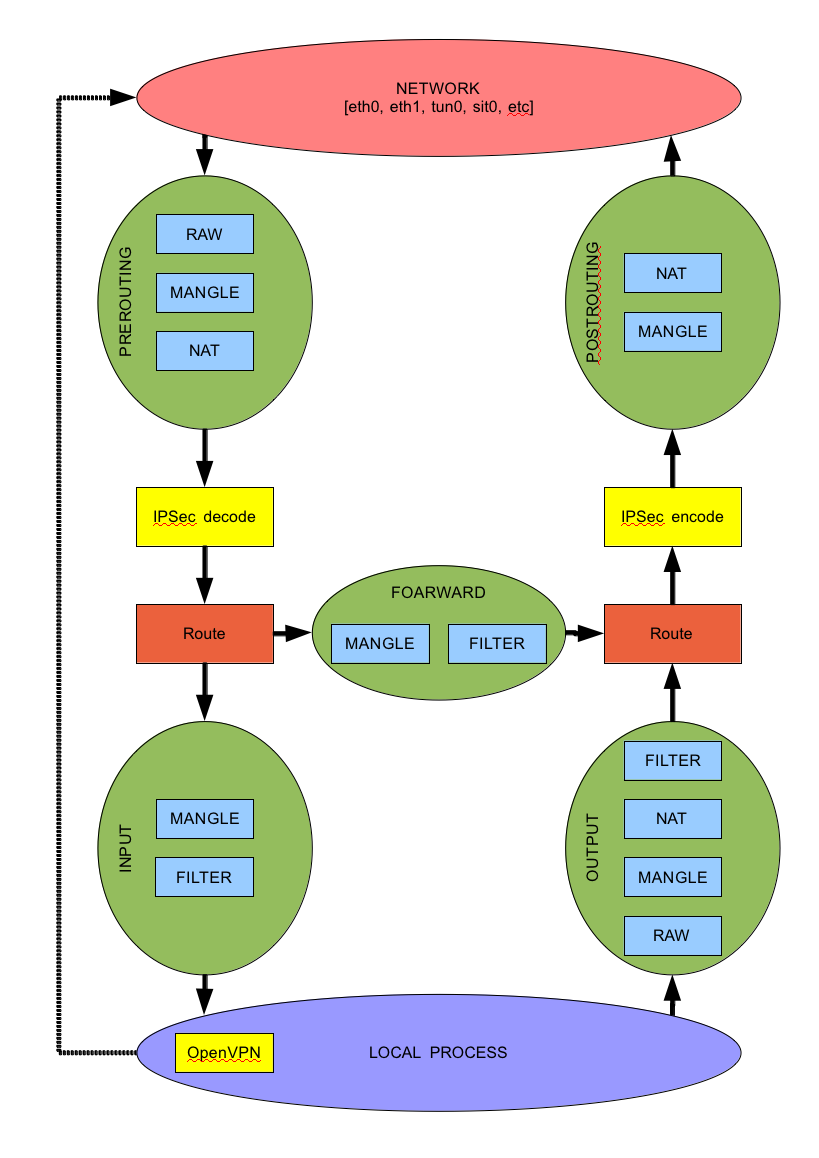 Как видно, таблица nat и mangle может модифицировать получателя или отправителя сетевого пакета. Именно поэтому сетевой пакет несколько раз сверяется с таблицей маршрутизации.
